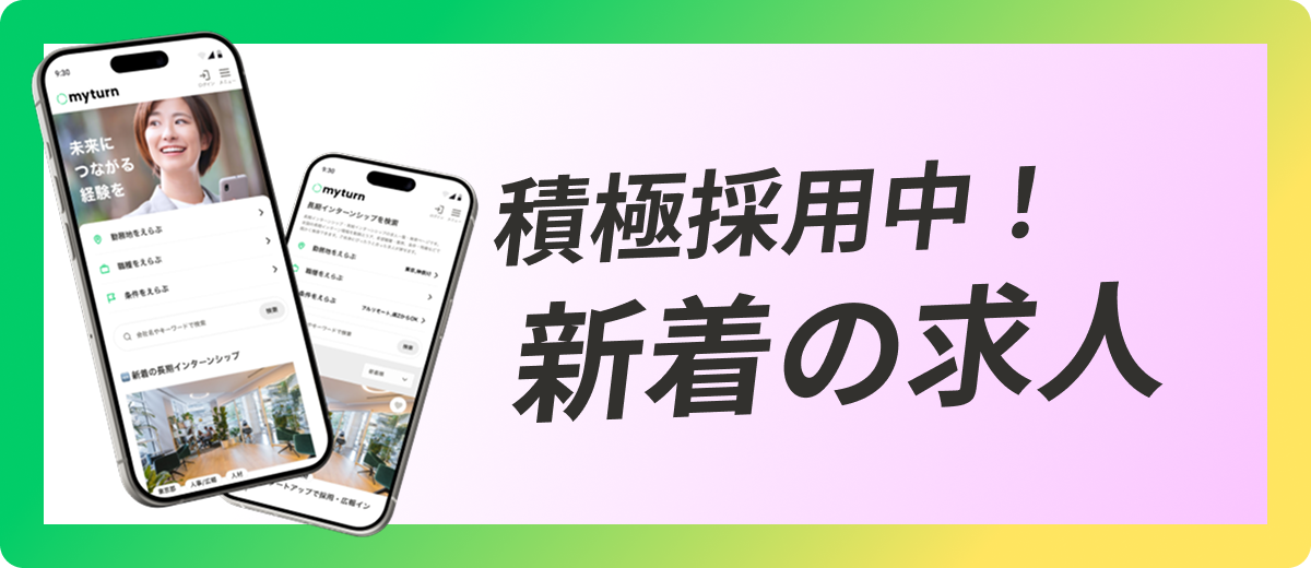 myturnは、2025年5月にリリースした、学生向けの新しい長期インターン求人サイト。スタートアップ、大手企業をはじめ、さまざまな業界、職種のインターン求人から自分にぴったりのインターンを探せます。